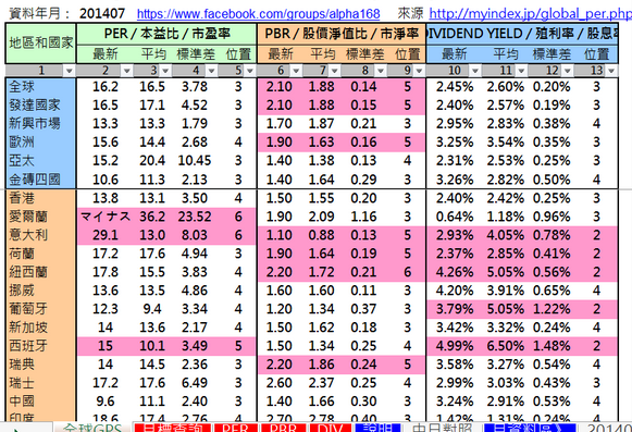 經過 tivo excel … 計算 各個國家基本面----per , pbr , dividend yield . 平均值 and 標準差