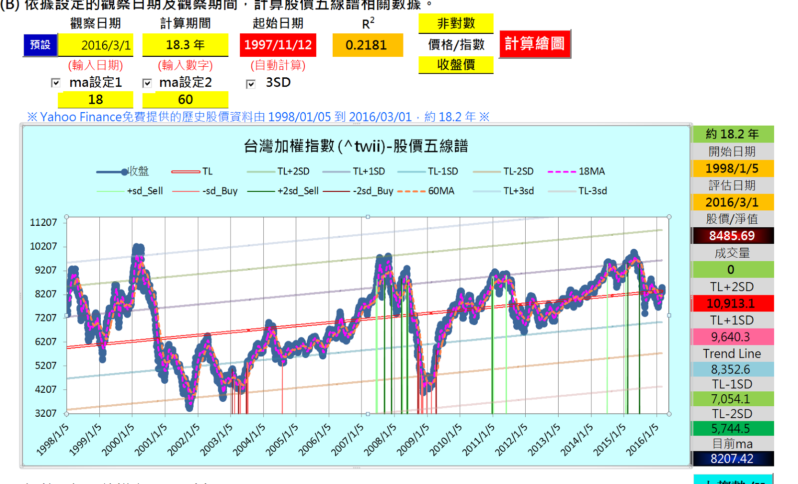 台商提出的 台股10 年線-10% 機率分布, allan 看到這個圖, 馬上就知道, (data from 1996.12.1 to 2016.2.1)